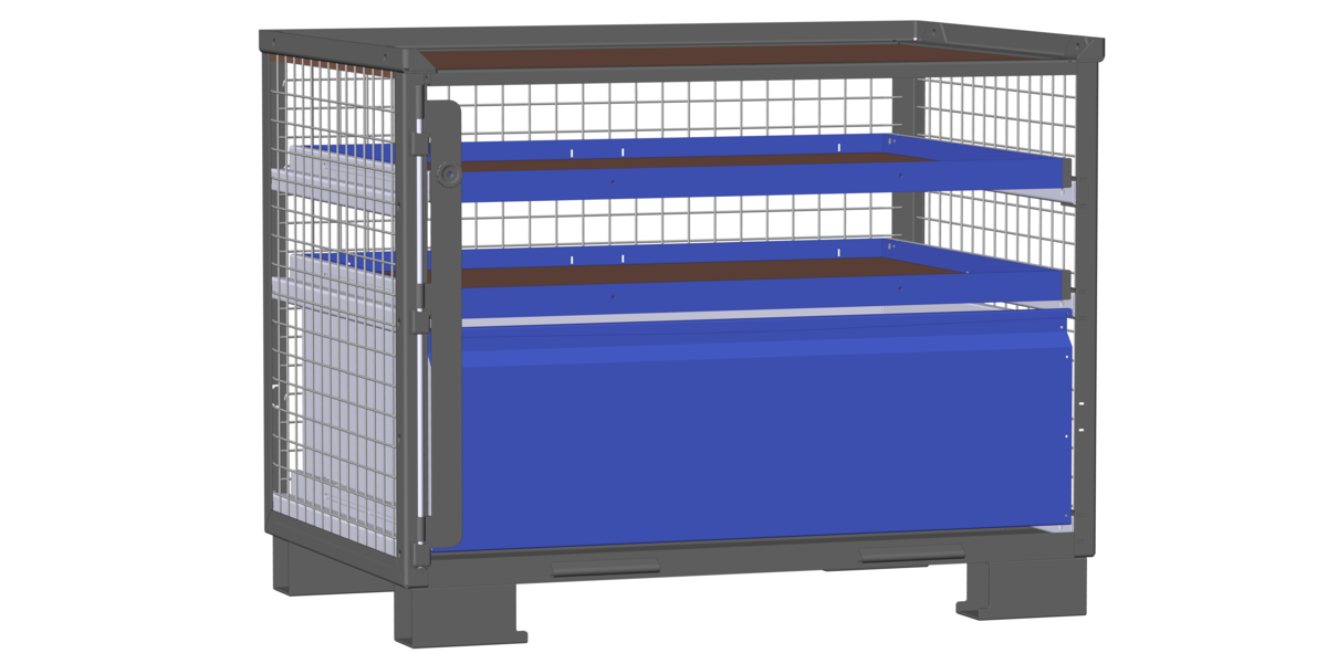 Zusätzlich schützt eine Verriegelungsklappe auf der linken Seite den Inhalt während Transport und Lagerung. Der verstärkte Oberrahmen mit vier stabilen Kranösen ermöglicht ein sicheres Heben und Umsetzen per Kran. Somit eignet sich die Box ideal für den Einsatz in Industrie, Handwerk, Fertigung und Logistik.