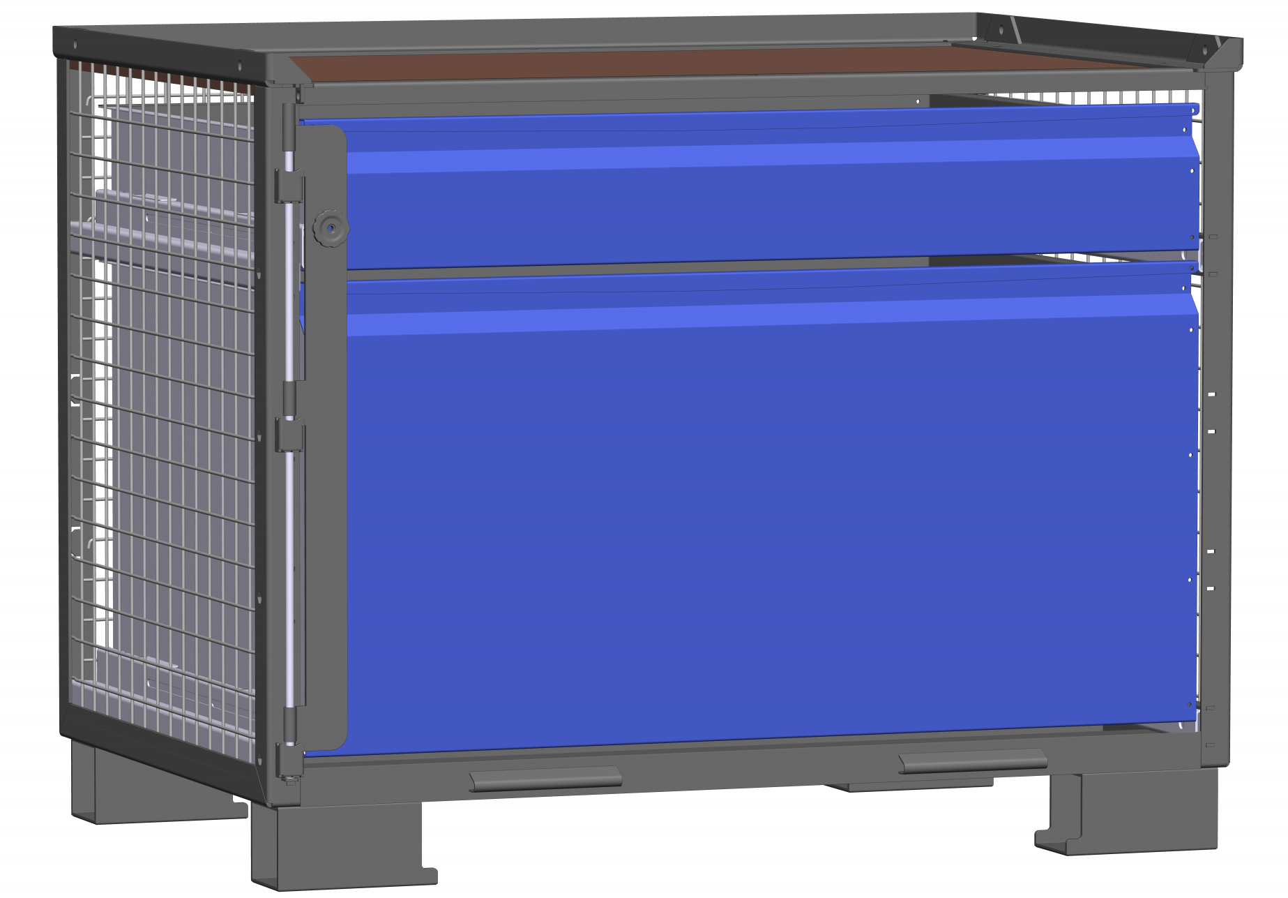 Ein weiterer Vorteil ist die integrierte Arbeitsfläche aus einer 12 mm starken Siebdruckplatte. Sie ist rutschfest, belastbar und besonders widerstandsfähig. Dadurch lässt sich direkt an der Box arbeiten. Die Fronten sind pulverbeschichtet in RAL 5002 Ultramarinblau und bieten nicht nur ein professionelles Erscheinungsbild, sondern auch wirksamen Schutz vor Kratzern und Korrosion.