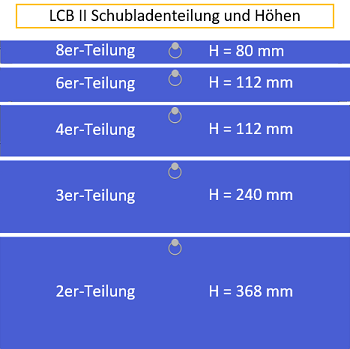 Die Schubladen sind in den Teilungen 2er, 3er, 4er, 6er und 8er erhältlich. Es können bis zu 8 Auszüge verbaut werden, ebenso sind Kombinationen möglich. Die stufenlos einstellbaren Auszüge ermöglichen die Einstellung der lichten Höhe nach Ihren Anforderungen.