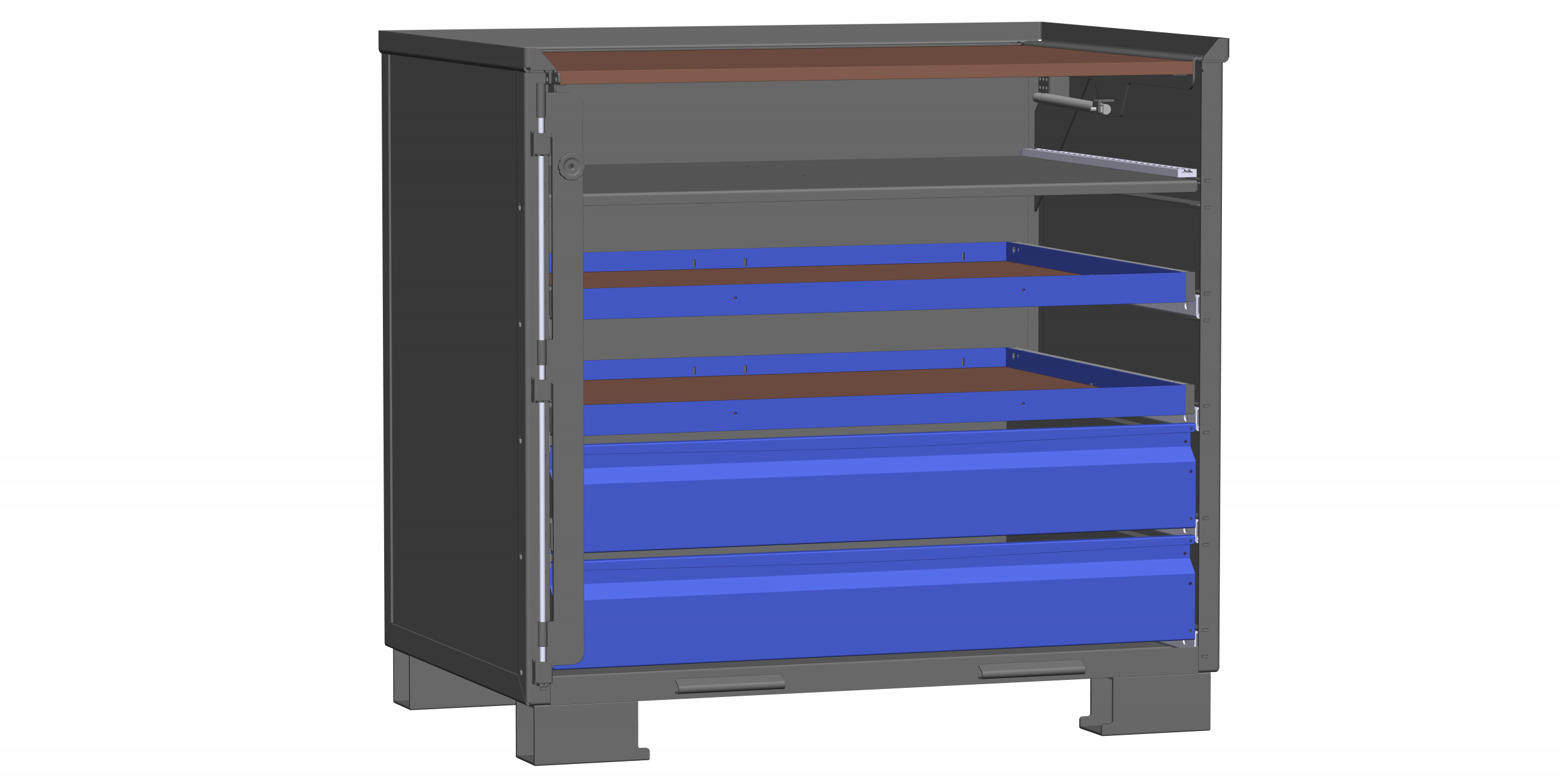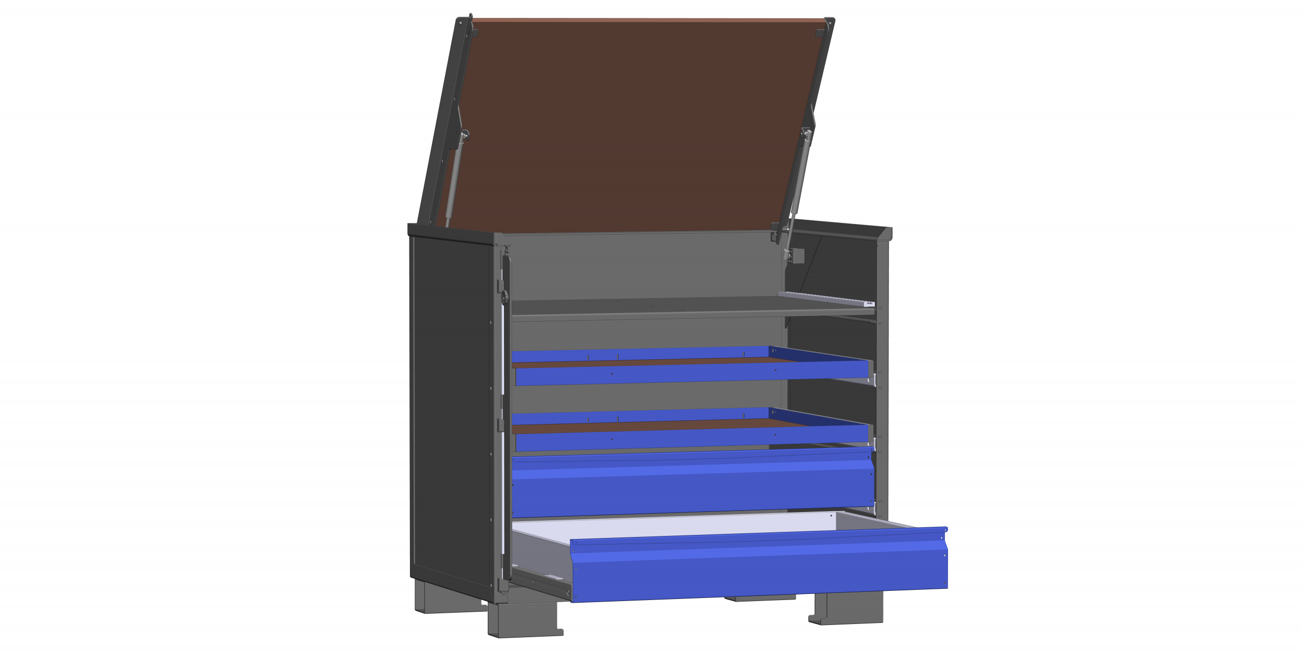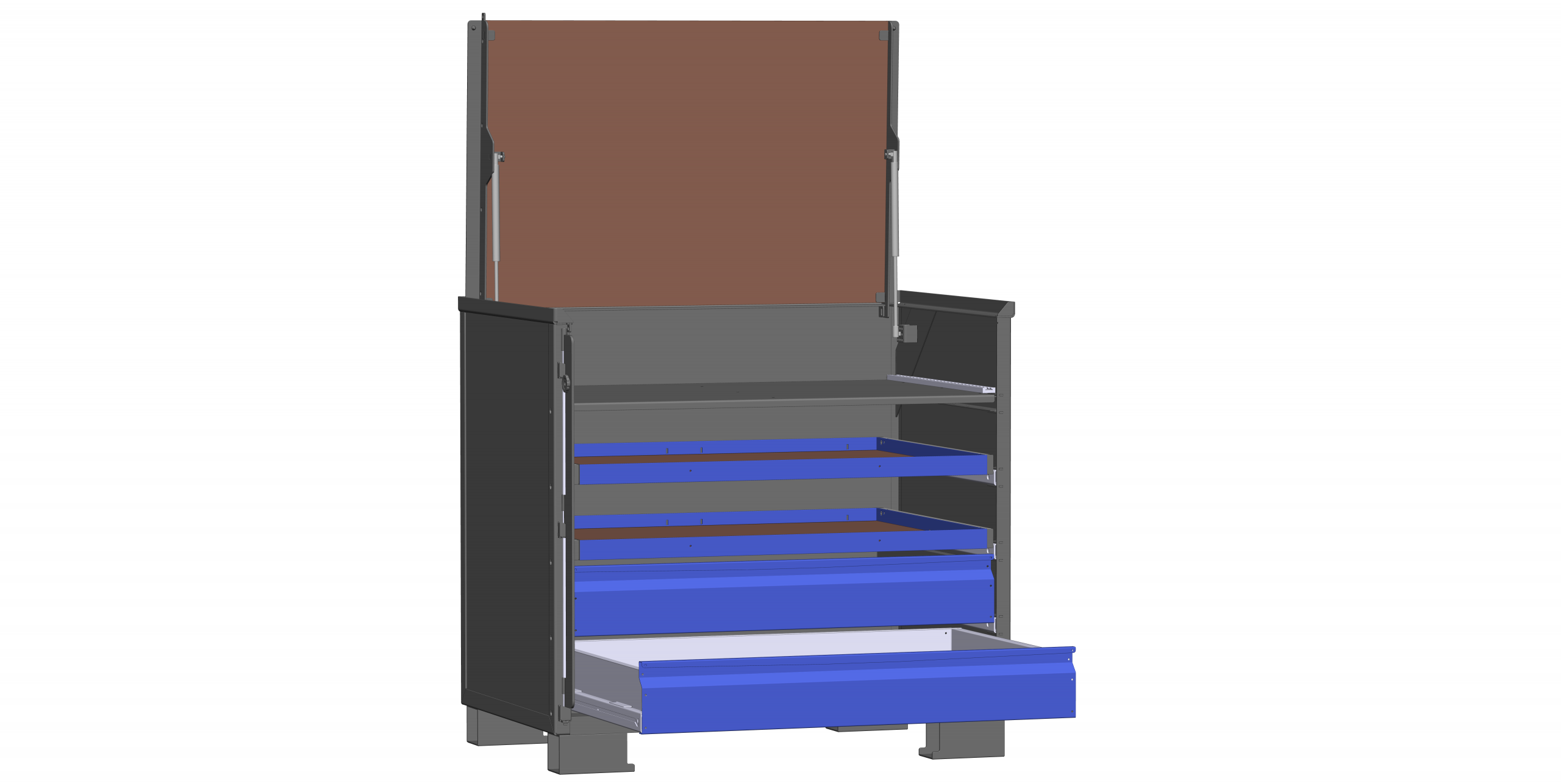 Schubladen und Auszugrahmen können jeweils mit bis zu 160 kg beladen werden, der feste Boden mit bis zu 400 kg. Der Deckel besteht aus einer 21 mm starken Siebdruckplatte und kann als Ablage- oder Arbeitsfläche genutzt werden. Der Deckel lässt sich bis zu 90° aufstellen, wodurch Freiraum geschaffen wird, um den festen Boden mittels Kran oder Stapler zu beladen. Je nach Konfiguration kann der feste Boden in vier Ebenen montiert werden; bei geschlossenem Deckel stehen dann 175 bis 745 mm Innenhöhe zur Verfügung – ausreichend Platz für größere Bauteile. Als Basis dient die LCB I Teilauszug mit 70% Auszugweg.