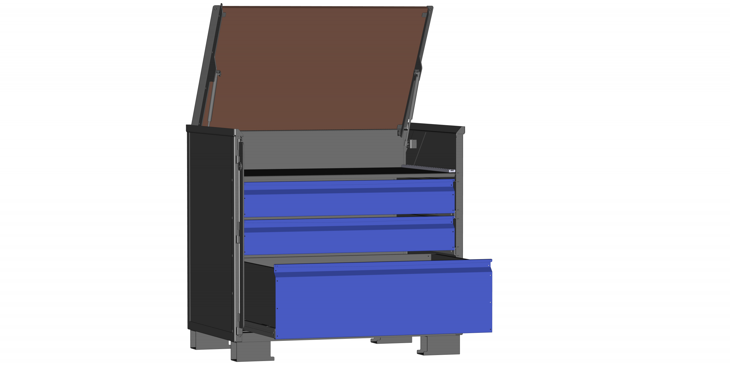 Schubladen und Auszugrahmen können jeweils mit bis zu 160 kg beladen werden, der feste Boden mit bis zu 400 kg. Der Deckel besteht aus einer 21 mm starken Siebdruckplatte und kann als Ablage- oder Arbeitsfläche genutzt werden. Der Deckel lässt sich bis zu 90° aufstellen, wodurch Freiraum geschaffen wird, um den festen Boden mittels Kran oder Stapler zu beladen. Je nach Konfiguration kann der feste Boden in vier Ebenen montiert werden; bei geschlossenem Deckel stehen dann 175 bis 745 mm Innenhöhe zur Verfügung – ausreichend Platz für größere Bauteile. Als Basis dient die LCB I Teilauszug mit 70% Auszugweg.