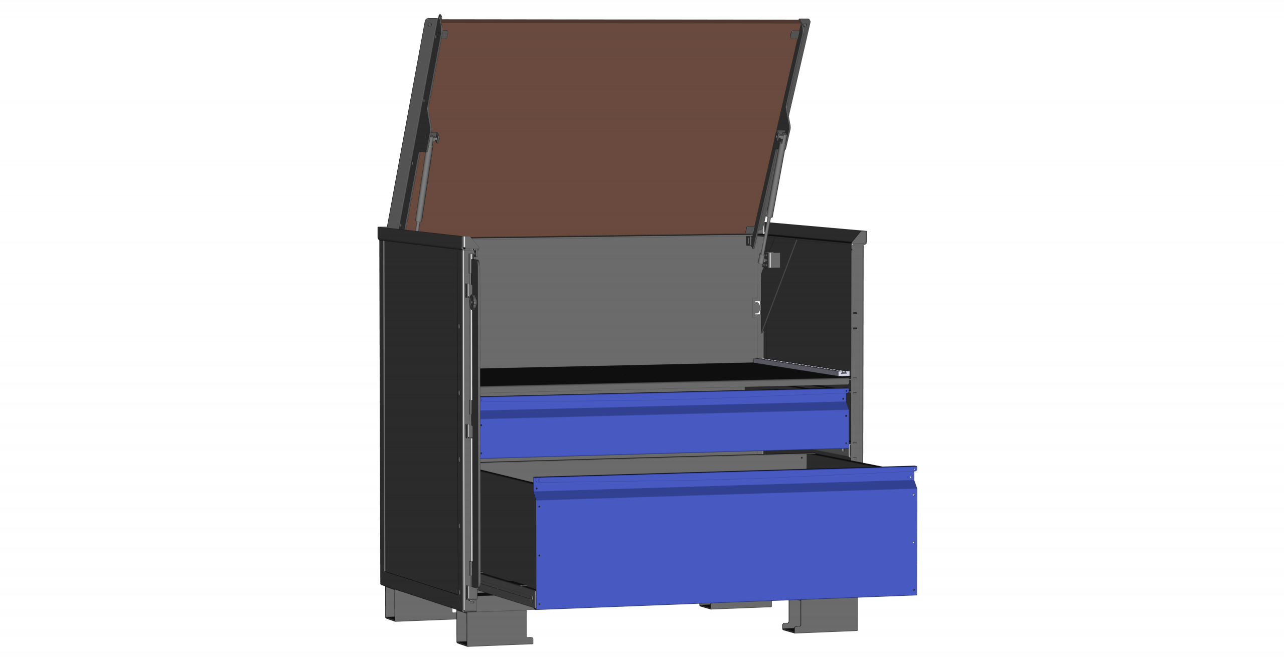 Schubladen und Auszugrahmen können jeweils mit bis zu 160 kg beladen werden, der feste Boden mit bis zu 400 kg. Der Deckel besteht aus einer 21 mm starken Siebdruckplatte und kann als Ablage- oder Arbeitsfläche genutzt werden. Der Deckel lässt sich bis zu 90° aufstellen, wodurch Freiraum geschaffen wird, um den festen Boden mittels Kran oder Stapler zu beladen. Je nach Konfiguration kann der feste Boden in vier Ebenen montiert werden; bei geschlossenem Deckel stehen dann 175 bis 745 mm Innenhöhe zur Verfügung – ausreichend Platz für größere Bauteile. Als Basis dient die LCB I Teilauszug mit 70% Auszugweg.