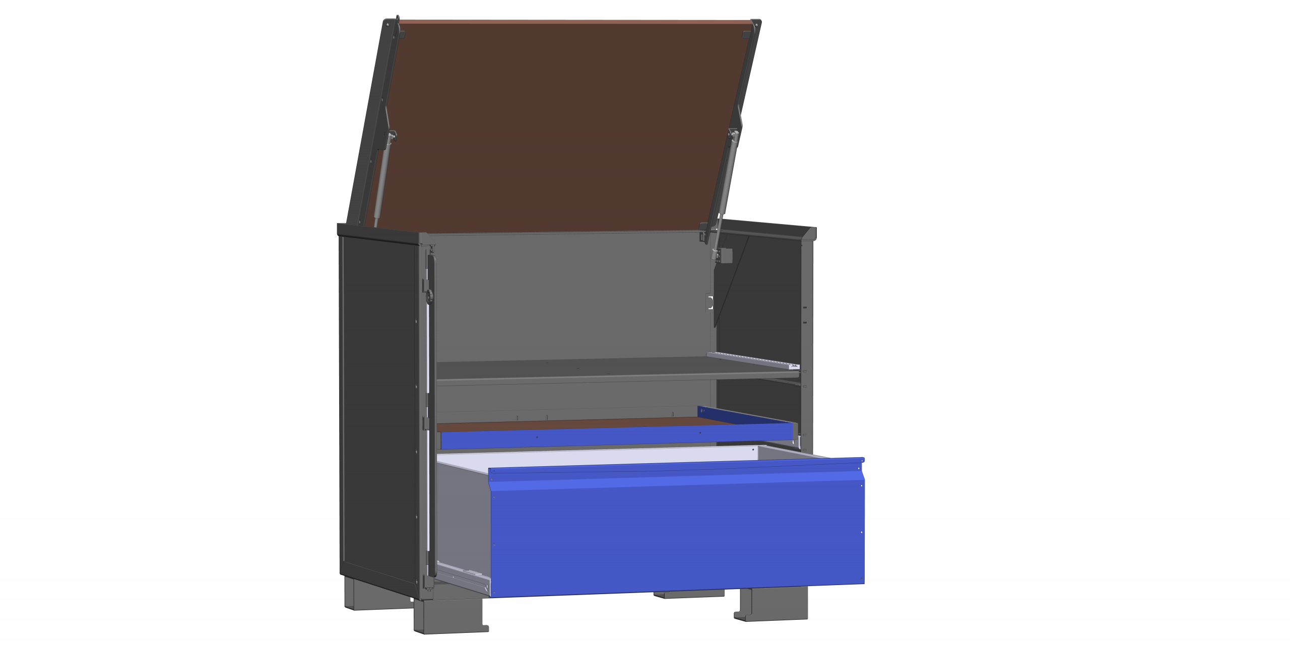Schubladen und Auszugrahmen können jeweils mit bis zu 160 kg beladen werden, der feste Boden mit bis zu 400 kg. Der Deckel besteht aus einer 21 mm starken Siebdruckplatte und kann als Ablage- oder Arbeitsfläche genutzt werden. Der Deckel lässt sich bis zu 90° aufstellen, wodurch Freiraum geschaffen wird, um den festen Boden mittels Kran oder Stapler zu beladen. Je nach Konfiguration kann der feste Boden in vier Ebenen montiert werden; bei geschlossenem Deckel stehen dann 175 bis 745 mm Innenhöhe zur Verfügung – ausreichend Platz für größere Bauteile. Als Basis dient die LCB I Teilauszug mit 70% Auszugweg.