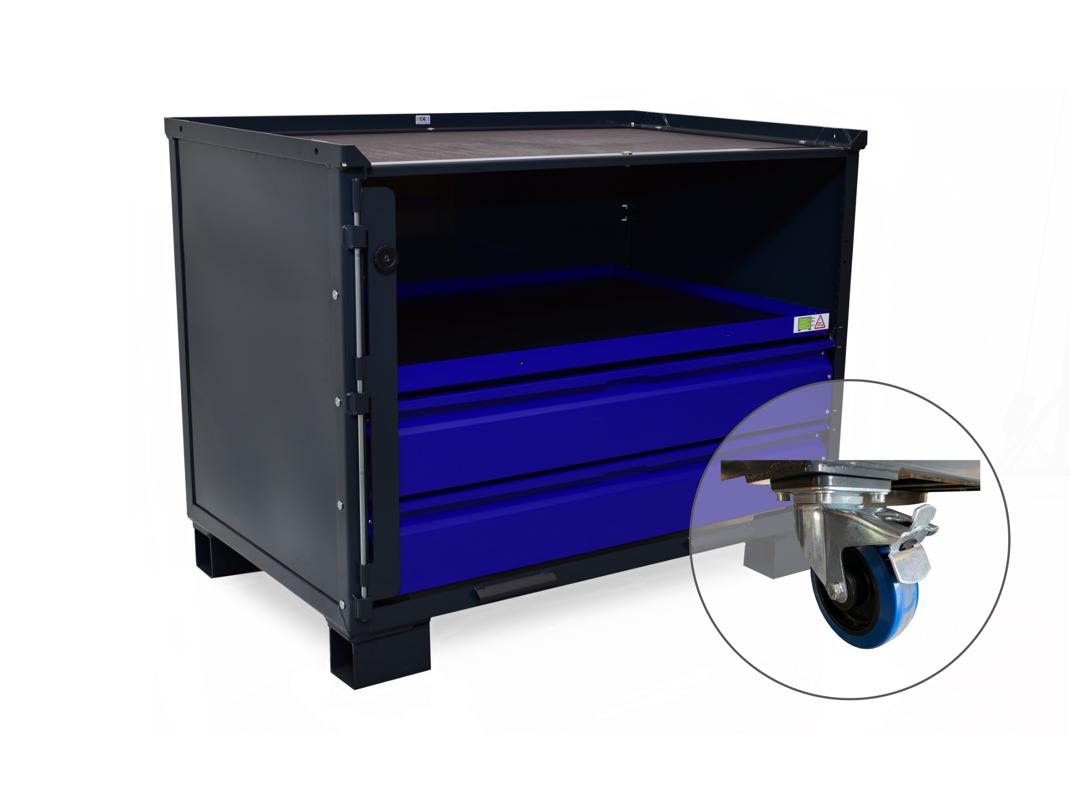 Optisch überzeugt die Box durch ihre pulverbeschichteten Fronten in RAL 5002 (Ultramarinblau). Diese sorgen nicht nur für einen modernen Industrial-Look, sondern auch für einen langlebigen Korrosionsschutz.