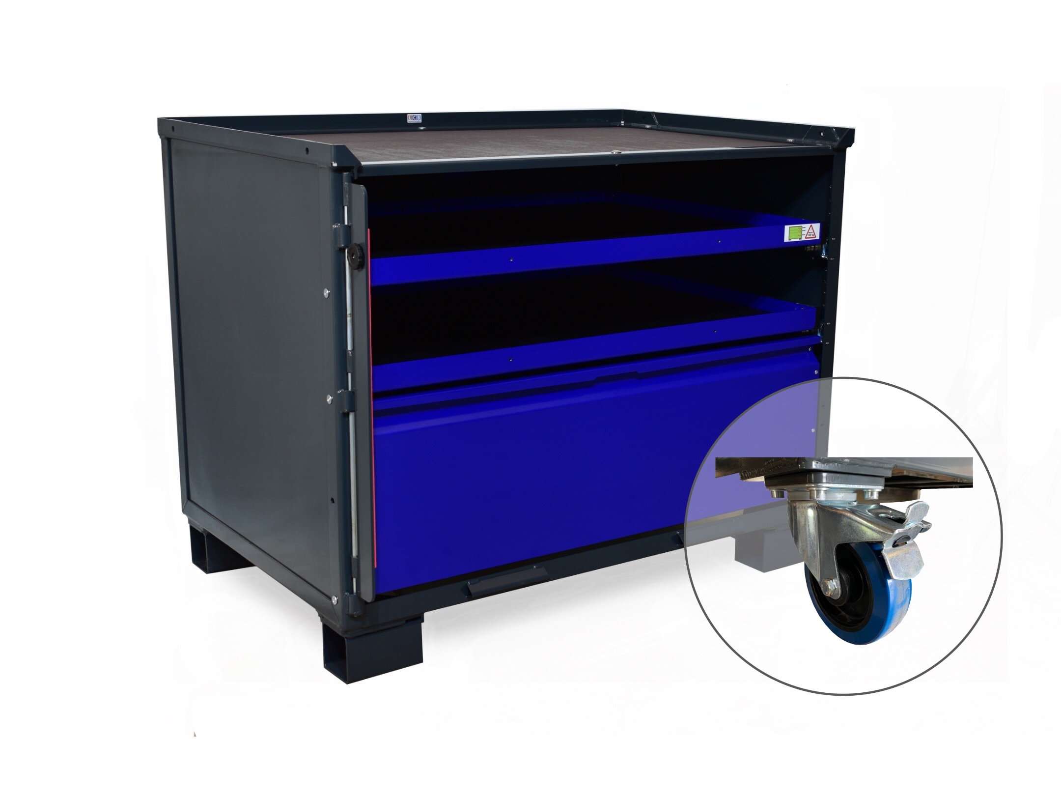 Der verstärkte Oberrahmen mit vier Kranösen ermöglicht ein komfortables und sicheres Handling per Kran oder Hebesystem. Die robuste 12-mm-Siebdruck-Arbeitsfläche dient als mobile Werkbank direkt am Einsatzort. Für maximale Mobilität ist die LCB I – 142033B mit zwei Bockrollen und zwei Lenkrollen mit Feststeller ausgestattet. Die pulverbeschichteten Fronten in RAL 5002 ultramarinblau bieten zusätzlich eine hochwertige, langlebige Optik.